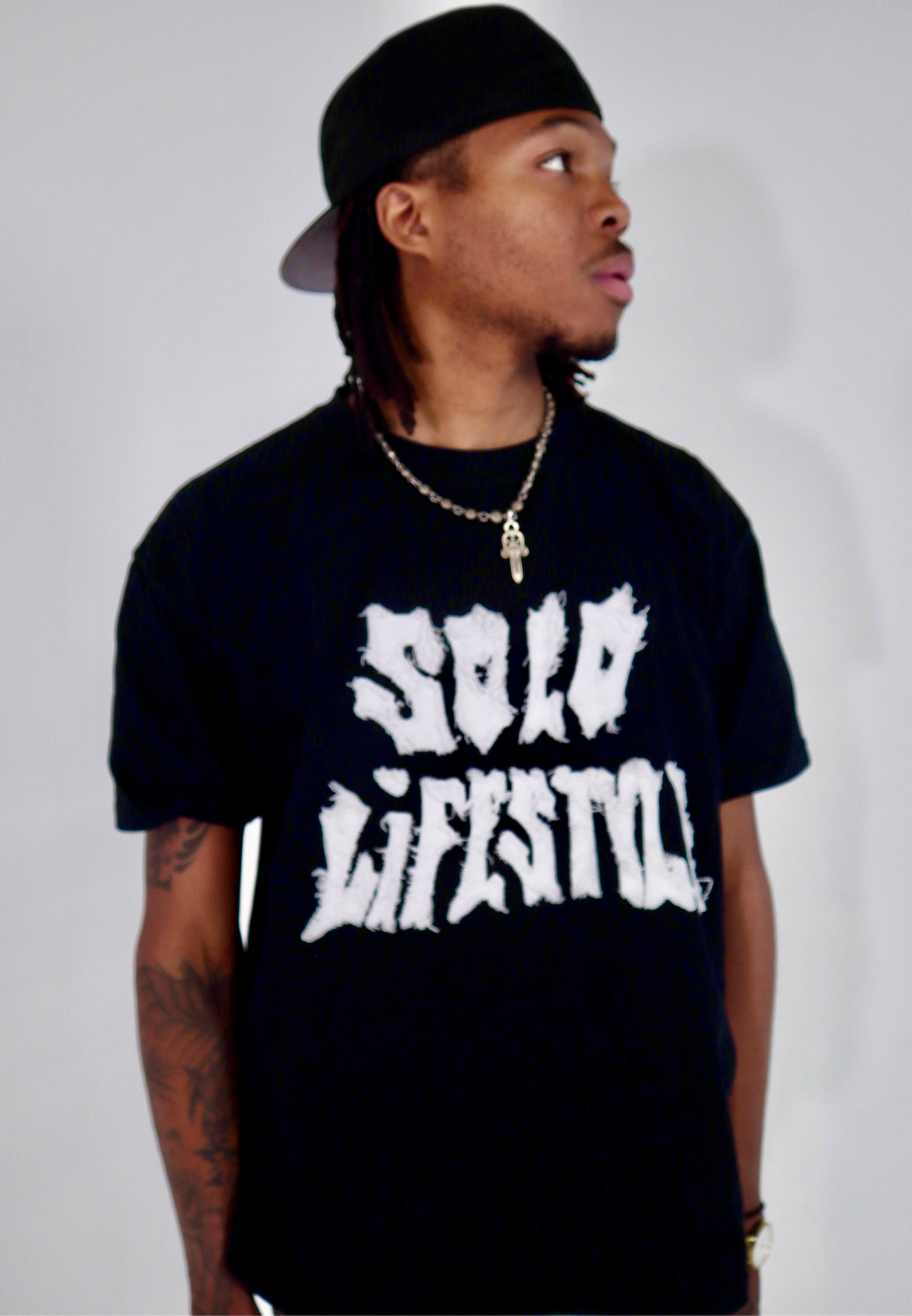 SOLO LIFESTYLE "Alone, Not Lonely" Distressed 002 T-Shirt. Designed for the modern streetwear lover, this versatile piece is perfect for effortless and stylish outfits. With its easy-to-match design, you can easily mix and match to create endless looks. Make a statement with Solo lifestyle.